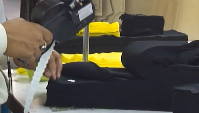 A hand labelling machine is used for attaching this gum sticker to the fabric panels. The stickering machine prints a pre-designed number on the paper sticker and stick on the fabric (garment parts).